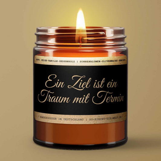 Motivations-Botschaft Kerze "Ein Ziel ist ein Traum mit Termin" Duft: Feige-Vanille-Zedernholz