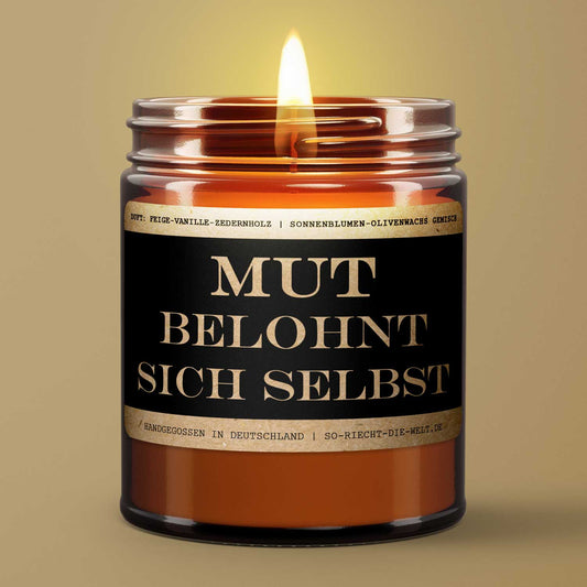 Motivations-Botschaft Kerze "Mut belohnt sich selbst" Duft: Feige-Vanille-Zedernholz