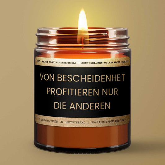 Motivations-Botschaft Kerze "Von Bescheidenheit profitieren nur die anderen" Duft: Feige-Vanille-Zedernholz