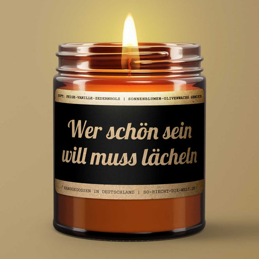Motivations-Botschaft Kerze "Wer schön sein will muss lächeln" Duft: Feige-Vanille-Zedernholz